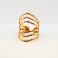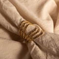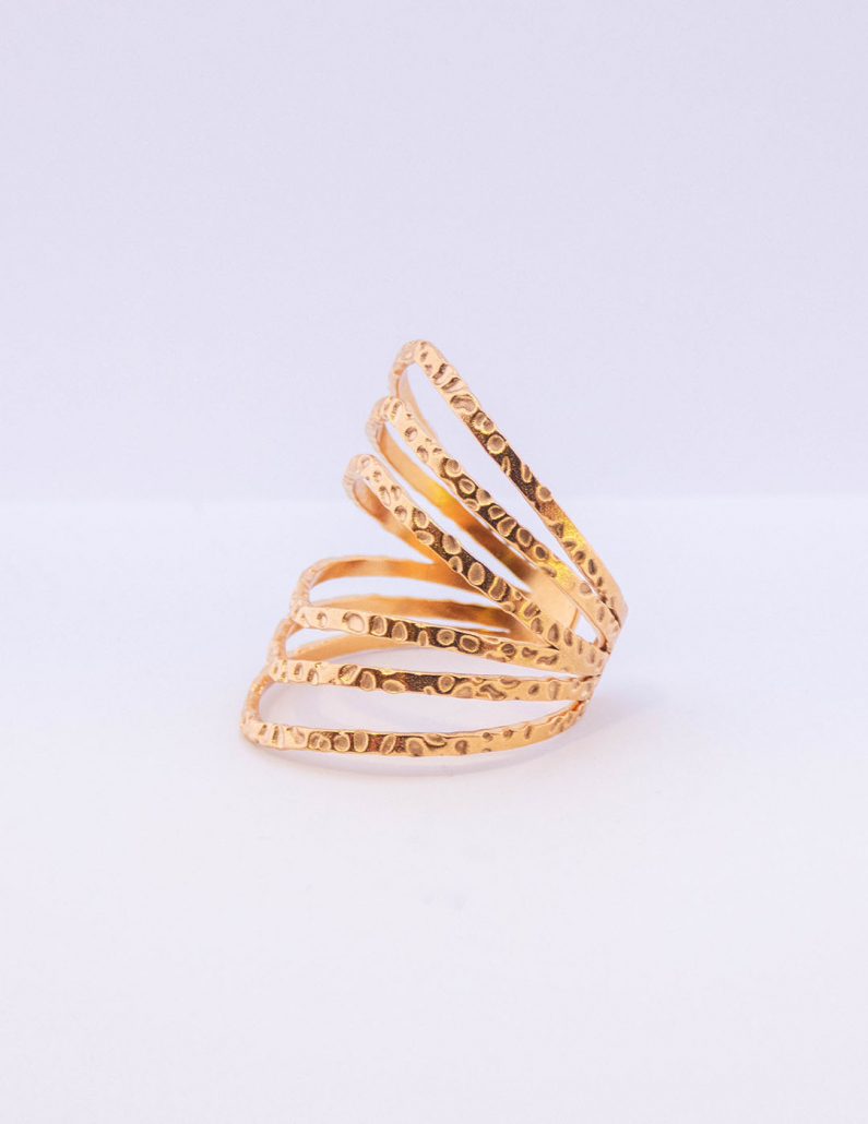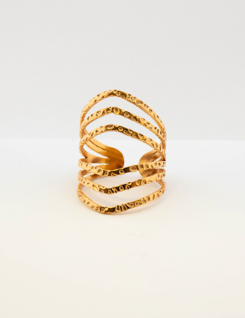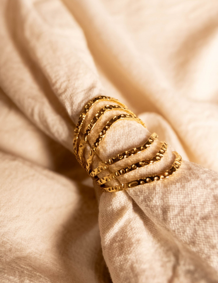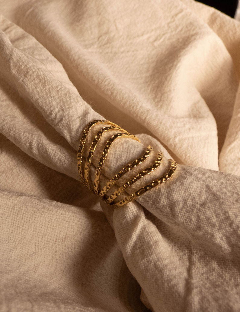 Despierta la curiosidad con nuestro anillo de textura moderna, elaborado en acero y resplandeciente con un baño de oro que realza cada detalle. Una joya contemporánea que refleja tu estilo vanguardista.