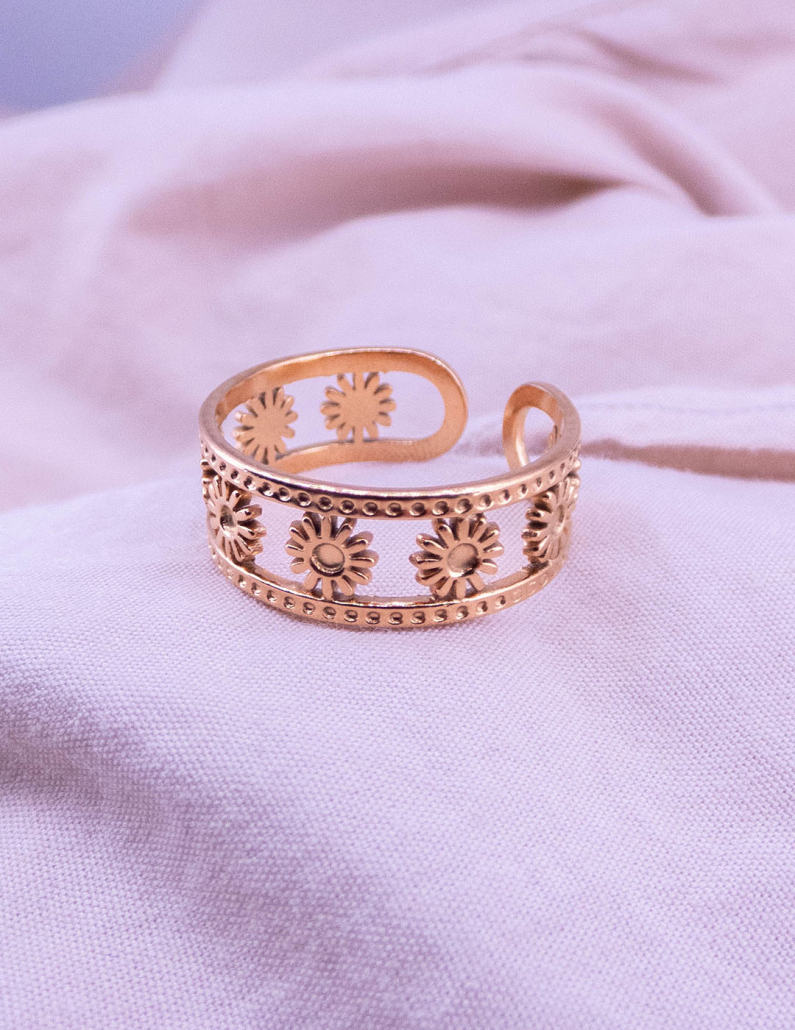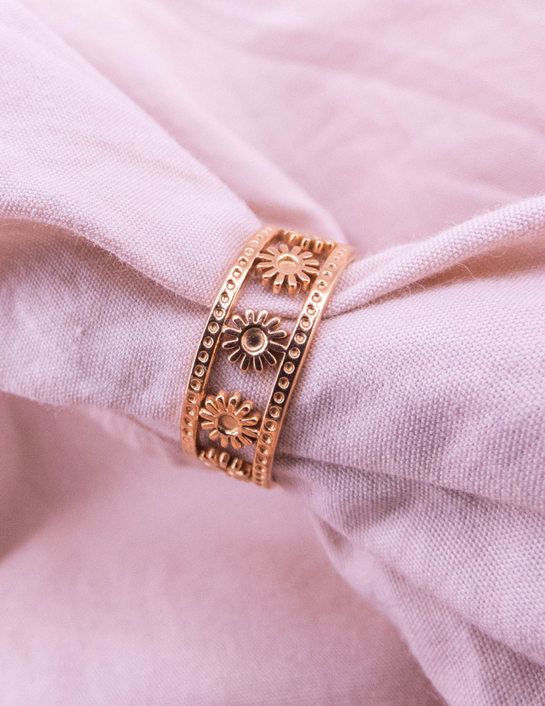 La simplicidad toma protagonismo con nuestro anillo con forma de pequeños soles de acero, resaltado por un baño de oro que añade un toque de brillo sutil pero impactante. Una joya clásica para toda ocasión.