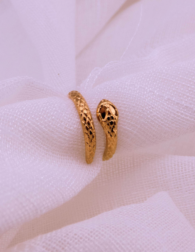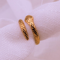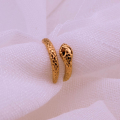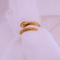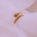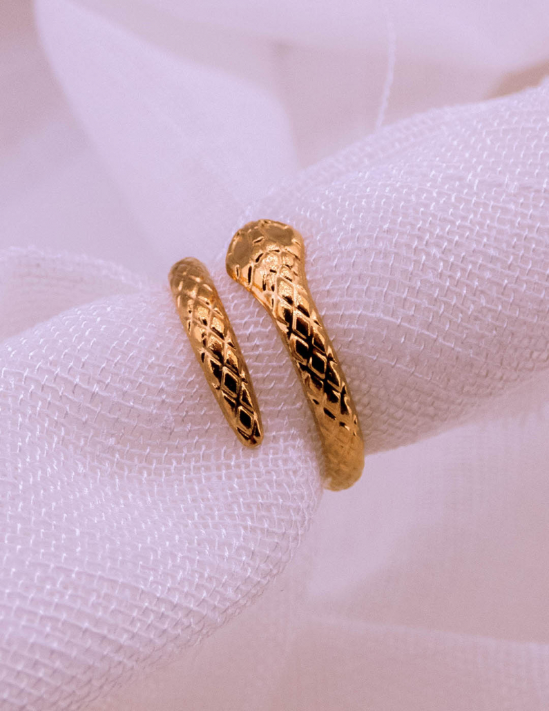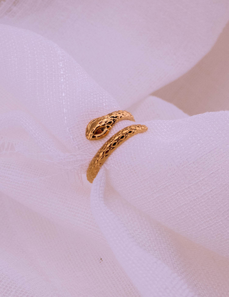 Sumérgete en la elegancia atrevida con nuestro anillo en forma de serpiente, fusionando la fuerza del acero con la opulencia del baño de oro. Cautivadora y única, la serpiente se enrosca con detalle artístico alrededor de tu dedo, creando una declaración de estilo que destaca por su originalidad y sofisticación. Esta pieza de joyería no solo es un accesorio, sino una expresión audaz de tu personalidad distinguida.