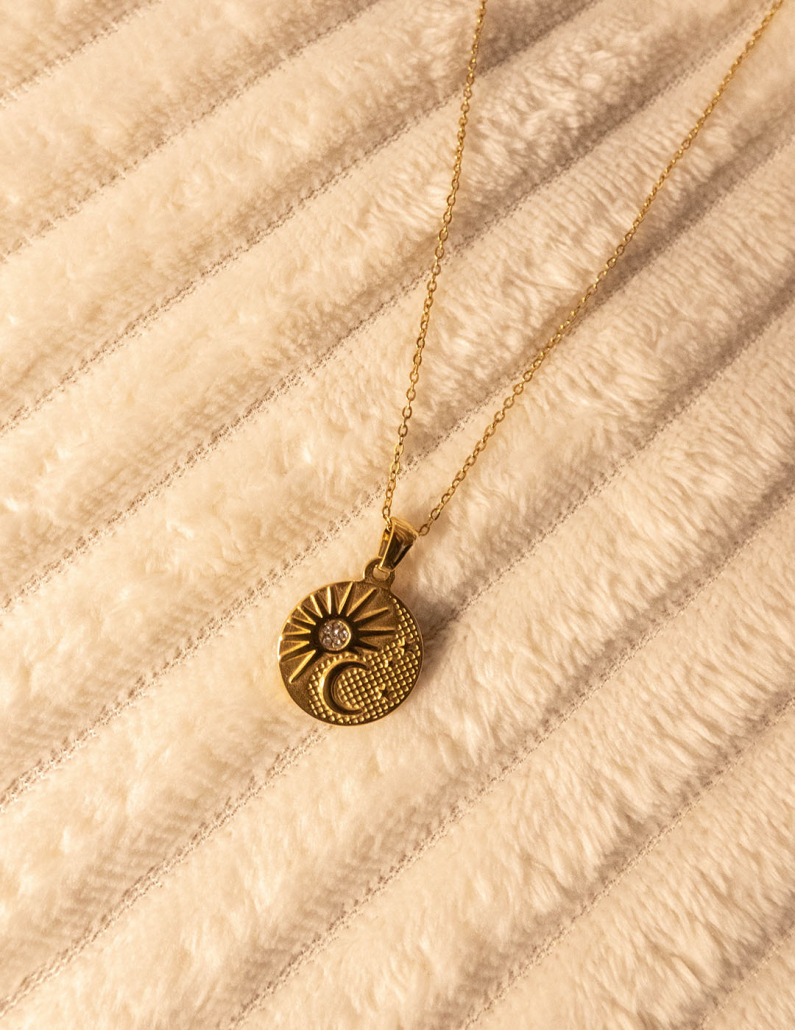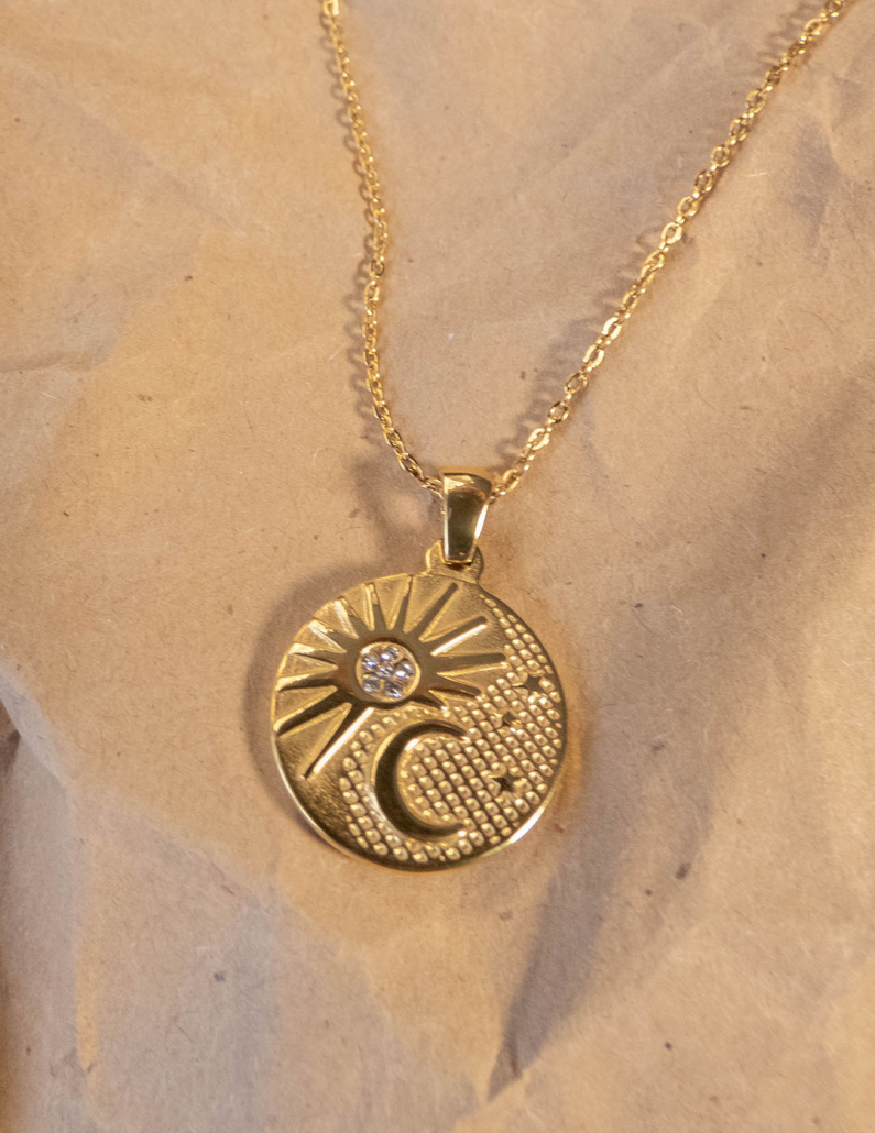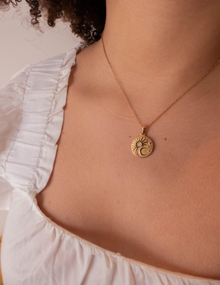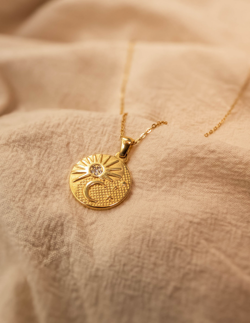 La combinación de acero duradero y baño de oro brillante define nuestro catálogo de colgantes. Un estilo atemporal que destaca tu individualidad con gracia y resistencia.