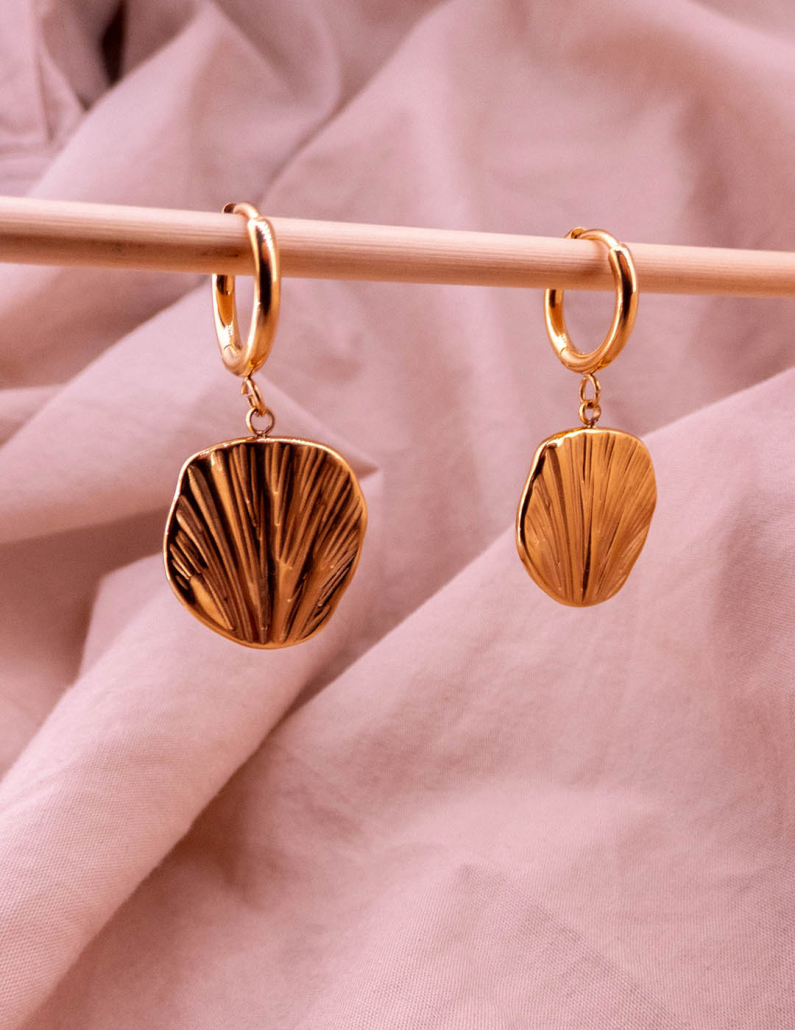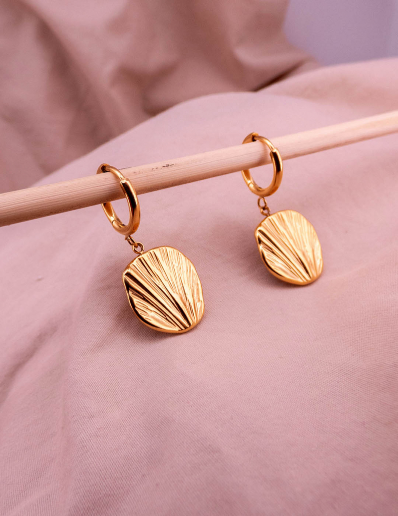Estos pendientes destacan por su construcción duradera en acero y su baño de oro reluciente. Ligeros y cómodos, son la elección perfecta para un toque de sofisticación en cualquier ocasión.